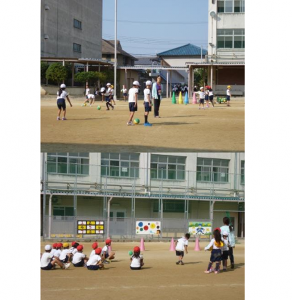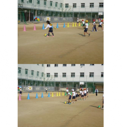 シュートしたボールを、相手チームに取られないように、自分のチームにうまくパスしたら、得点になります。シュートやパスの練習をしてから、ゲームをしました。