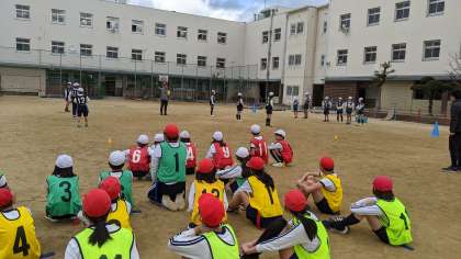 中学校の体育の先生に来てもらい、タグラグビーを教えていただく学習が始まりました。