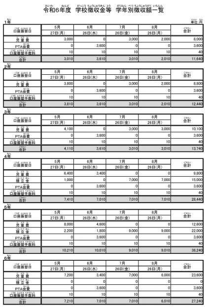 お子さんを通じて、5月14日付「令和6年度 学校徴収金等の納入について」を配付しておりますのでご確認ください。