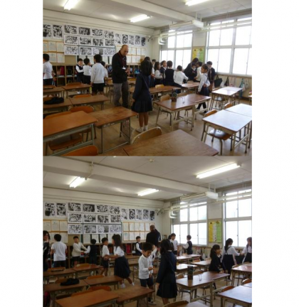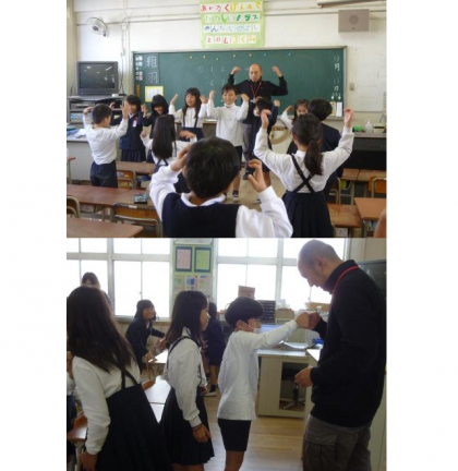 2年生の英語学習の様子です。1から10までの数字の言い方を教えてもらいました。その後、1から10までが入った歌を、振付けを交えて歌いました。また、二人組になり、お互いの指を出して、その指の数を足して、先にその数を英語で言った方が勝ちになるというゲームをしました。とても盛り上がっていました。