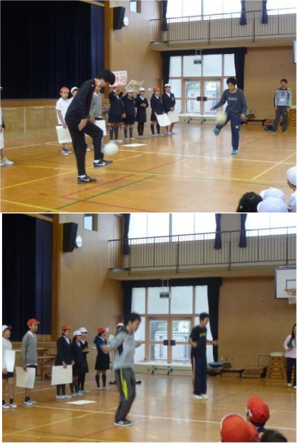 今日の児童集会は運動委員会のクイズでした。バスケットボールが上手なのはどちらの先生ですか?やリフティングが上手なのはどちらの先生ですか?などというクイズだったので、とても盛り上がりました。最後の問題は、桑山先生と岡本先生のどちらが長い間二重とびができますか?という問題のときは、一番盛り上がりました。