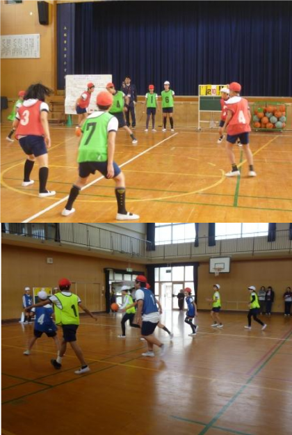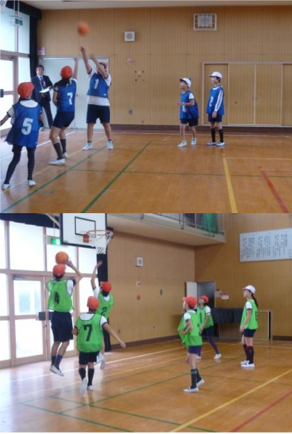 6年生のバスケットボールの授業です。初めに、音楽に合わせて、ボールを使った準備運動をしました。その後パス練習、シュート練習、ドリブル練習などチームの課題にそった練習をしました。最後に、練習試合をしました。