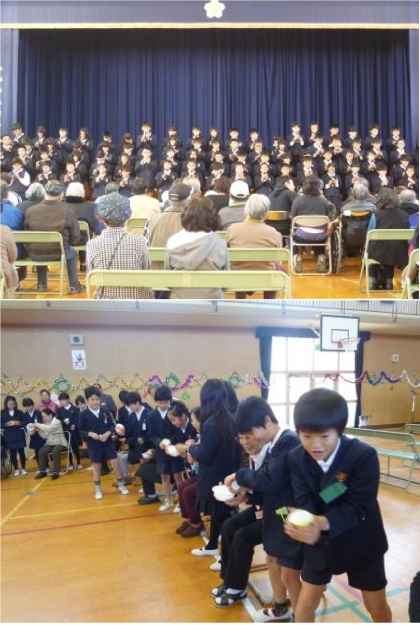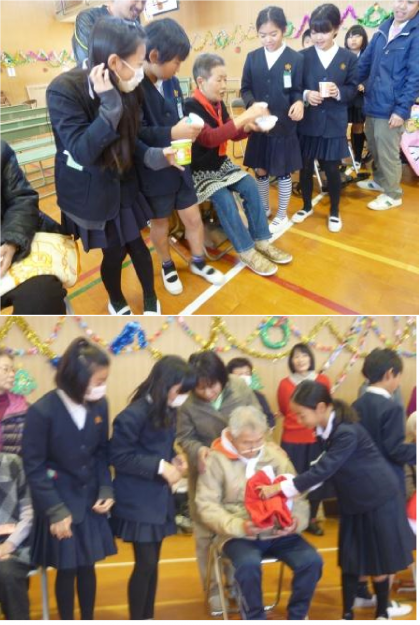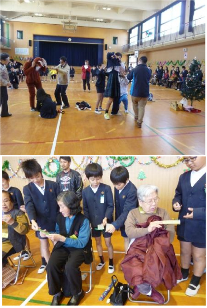 地域のお年寄りの方と5年生とのふれあいの会が3時間目にありました。5年生の人たちによるリコーダーの演奏や歌の後、参加されたみなさんと、物送りゲームをしました。お年寄りの方々とクリスマスツリーの飾りやサンタの服などを、順番に送っていって完成させます。5年生の先生方も参加されて、楽しい時間を過ごすことができました。