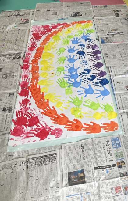 色を決めて、ペタペタして…、素敵な虹ができました。