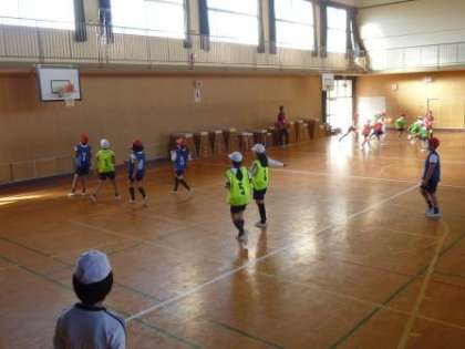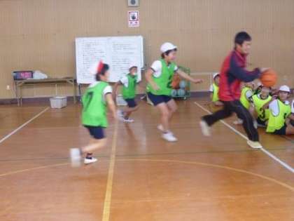 5年生のバスケットボールの授業です。チームで考えた作戦がうまくいくように練習したあとで、試合をしました。先生が練習の見本を見せていました。