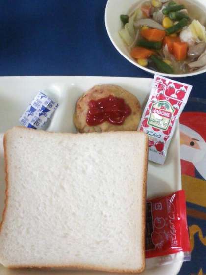 今日の食パンにはいちごジャムがつきました。とうふハンバーグには1人1袋ケチャップがつきました。