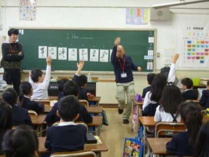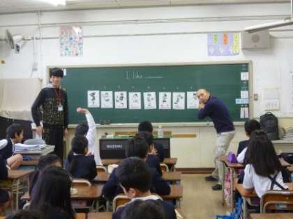 二人組になり、じゃんけんをして負けた人が絵を見て答えます。その後、先生のジェスチャーを見て答えました。
