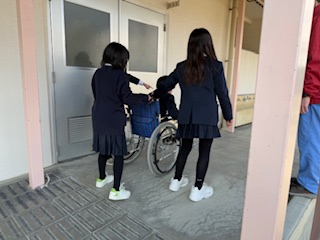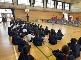 金曜日に車いす体験を行いました。自分が車椅子に乗る時の操作方法や、人を乗せて運ぶ時のポイントなどを教わりました。実際に操作してみて、「意外と難しい!」などと話しながら楽しく学びました。