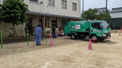 環境局の方々に来ていただき、パッカー車体験を行いました。いろいろな仕組みについて説明を聞いたり、自分たちで探したりしながら、楽しく学習しました。運転席に座らせてもらいました。