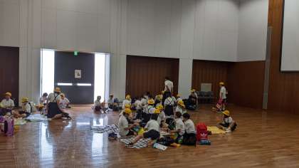 雨が心配だったので、建物の中で、お弁当を食べることにしました。仲良く食べています。実験した部屋です。この後、学校に戻ります。
