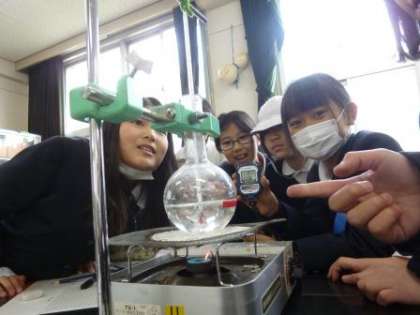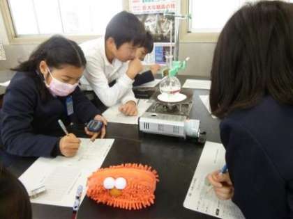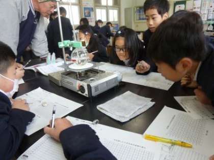 4年生の理科、「水を熱するとどのようになるでしょう」という実験の様子です。温度がどんどん上がっていくにつれて、水の様子が変わっていくのを真剣な表情で観察していました。