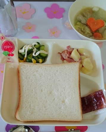 今日のスープ煮には、ハートや星の形のラッキーにんじんが入っていました。食パンにはいちごジャムがつきました。野菜サラダにはマヨネーズがつきました。