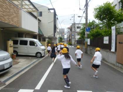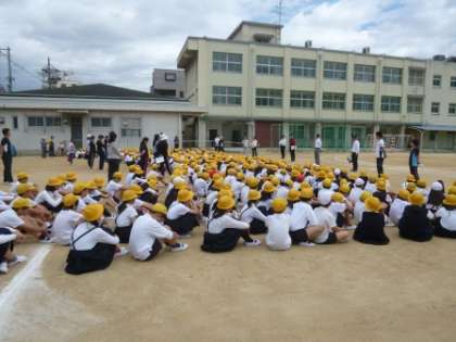 家庭科室から火災が発生したと想定して、巽中学校に2次避難しました。お・は・し・も(おさない・はしらない・しゃべらない・もどらない)をしっかり守り、みんな真剣に取り組んでいました。