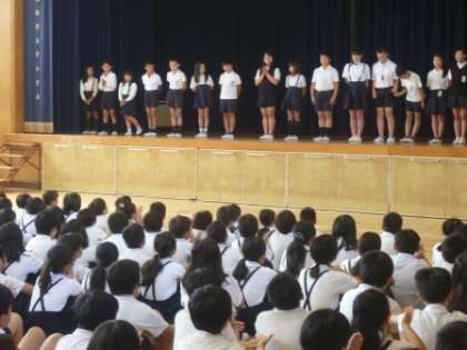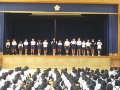 今日は、今年度初めての児童集会がありました。前期の児童会のメンバーが自己紹介をしました。