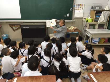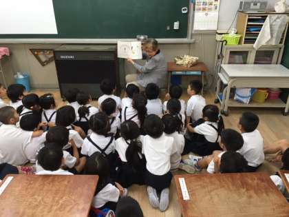 水曜日の朝は、毎週恒例の朝読タイム。上の写真は、図書ボランティアの方に、読み聞かせをしていただいている様子です。