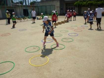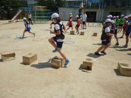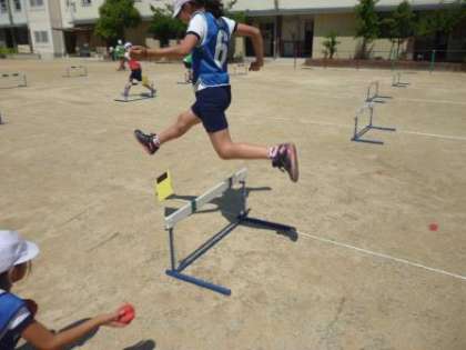 5時間目に、体育の授業研究会がありました。運動場で『フラッグハードルリレー』を行いました。自分のハードリングの課題に、友だちと協力しながら取り組んでいました。