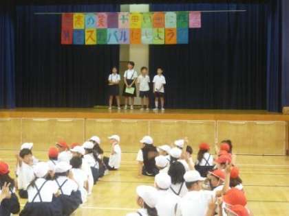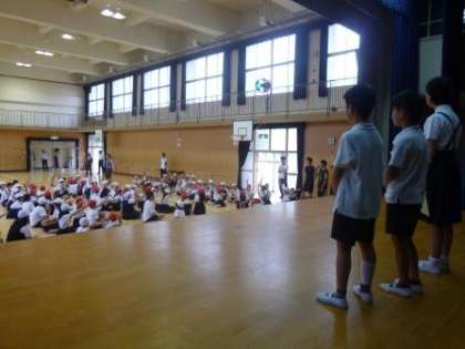 今日の集会は、先生を3つのヒントで当てるクイズを行いました。集会委員のヒントをもとに、ペアで相談して楽しくクイズに答えていました。