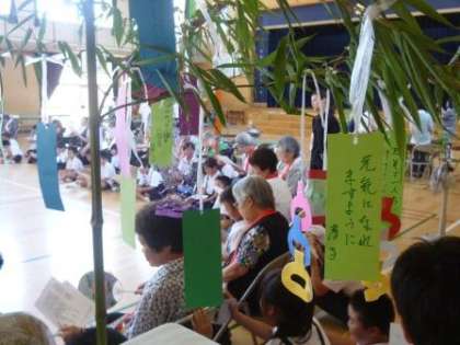 今日、地域の方を招いて「ふれあい七夕祭り」を行いました。4年生が発表するだけでなく、願い事を短冊に書いたり、いっしょにゲームをしたりと、楽しく活動しました。