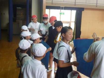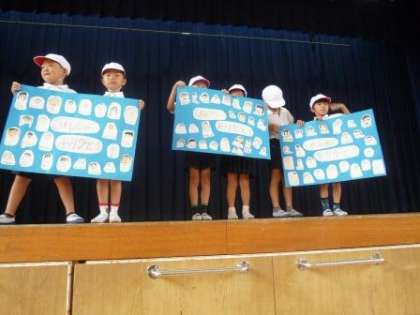 また、今日が1学期最後の集会だったので、今まで校歌を教わったり、巽フェスティバルでお世話になったりした6年生に、1年生からプレゼントが渡されました。