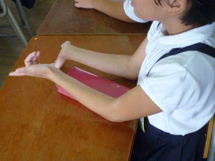 今日は、それぞれの気分をジェスチャーで表すことも教わりました(写真下)。