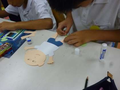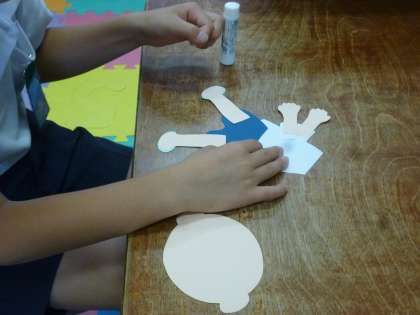 次に、色画用紙で作った身体の各パーツを糊づけしていきます。腕をつける時、「万歳しているところにしよう」、「玉を投げている様子にしよう」と、様々な声が聞こえてきます。