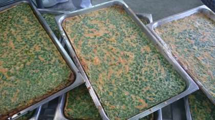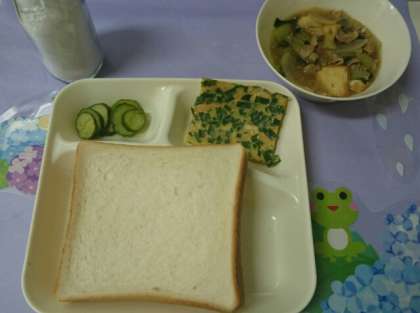 今日のパンは、食パンでした。ブルーベリージャムがつきました。チヂミは生卵77個使っています。