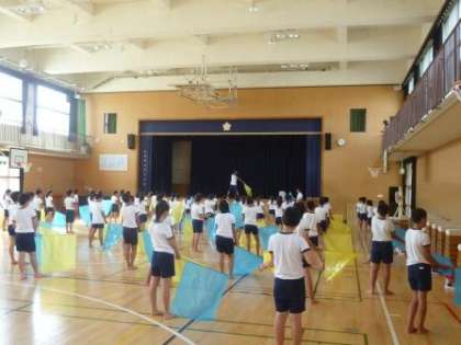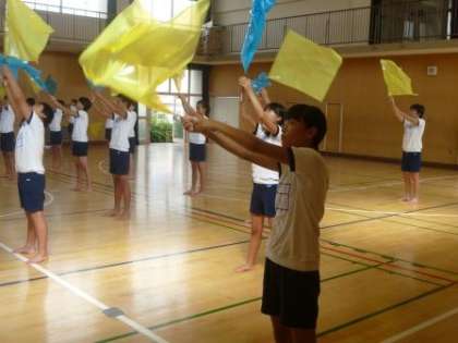 たくさんある曲の中の旗を使った部分の練習でした。全員が心をそろえ、息の合ったダンスを行っていました。