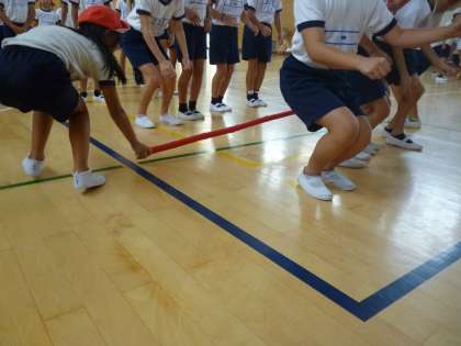この写真は、3年が運動会で行う、団体競技「台風の目」の練習の様子です。