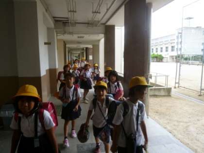 暴風警報発令後、速やかに集団下校ができるようにすることを目的に行いました。放送に従い、下校準備後に班長が1年生を迎えに行き、各地区ごとに集団下校を行いました。