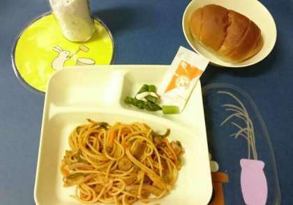 今日のパンは1/2パンでした。サラダには卵不使用のノンエッグドレッシングがつきました。