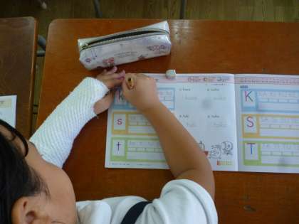 新出漢字の学習と同様に、指書きで何度か練習します(写真・上)。その際に、担任から筆順の確認や字体の特長などについて、指導します。その後、ドリルに実際に書いて練習をします(写真・下)。