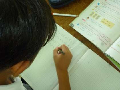この時間では、学習内容に即して、マスや行を空ける約束事を勉強しました。また、速く、ていねいに書くことも意識しました。授業後、「すっきりしたノートになった」「字が見やすくなった」などの感想の声がもれていました。