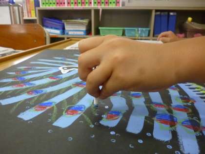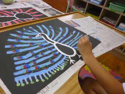 絵筆を使ってポスターカラーで骨組みを描いた1回目、パスを使って羽根の模様を塗りこんだ2回目、今回は、綿棒を使ってポスターカラーで点や波線、ぎざぎざの線などを描きながら、仕上げていきました。