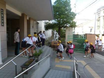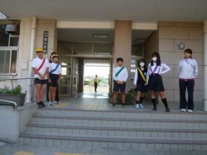 学校全体ですすんであいさつをしようという姿勢を習慣づけるために、今日からあいさつ運動をしていきます。4〜6年の児童が「あいさつレンジャー」のたすきをかけて、あいさつを行います。
