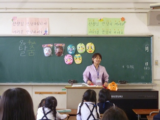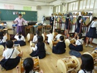 低学年は、「お面踊り」で使われるお面についてお話を聞きました。来週は自分たちでもお面を作る予定です。高学年は、自分たちで選んだ楽器の練習をしました。
