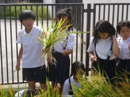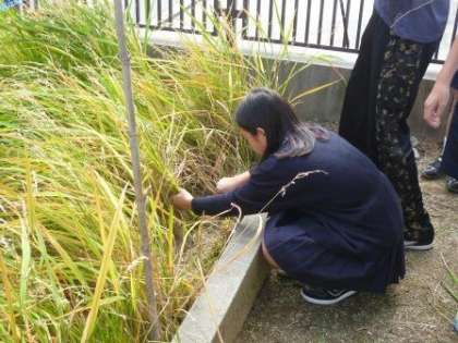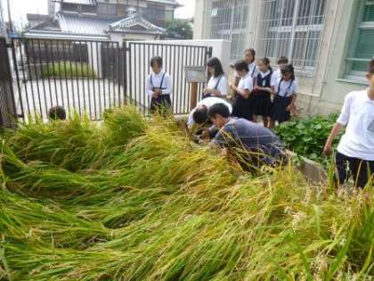 春から始めた米作り。実り育ったので、総合的な学習の時間に「稲刈り」を行いました。