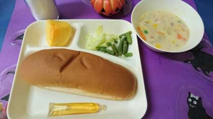 今日のコッペパンには、はちみつがつきました。コーンクリームシチューは小麦粉を使用せず上新粉を使用しています。