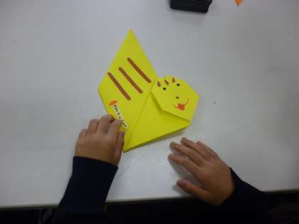 いつも使っている折り紙の2倍はある大きな折り紙ですので、複雑な折り方に際しても、ずいぶん楽に折っていきます(写真・上)。