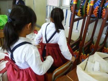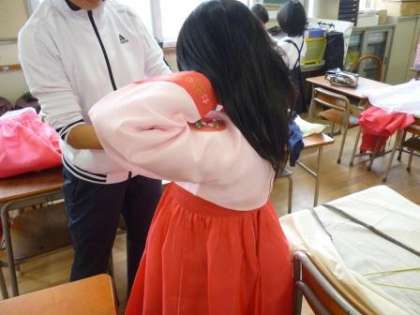 今日の民族クラブは、11月5日(土)に行われる「東部子ども民族文化祭」のしおりの配布と、衣装の最終あわせをしました。