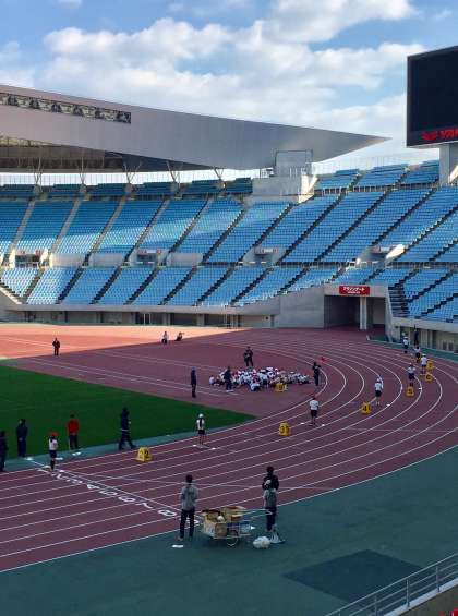 400m リレーが始まりました。華麗なるバトンパスができるでしょうか、、、