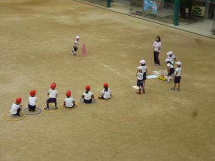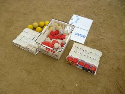 運動会の玉入れで使う紅白玉やティーボールという子どもが扱いやすい大きさのボールを使って学習を進めました。