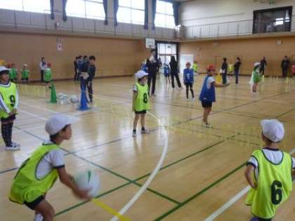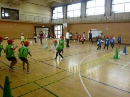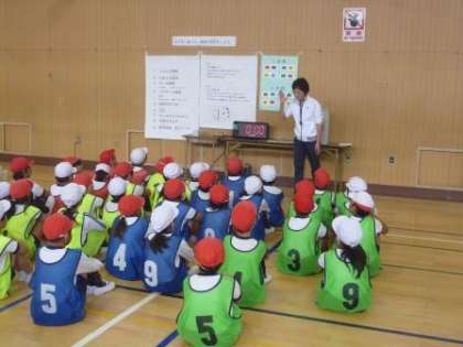 講堂で体育科の「プレルシュートゲーム」という単元の学習を行いました。バレーボールの動きにつなげるためのネット型のゲームです。子どもたちは友だちと励まし合い楽しく活動していました。