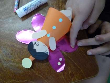 まず、天使の顔をネームペンで書きます。後は、色画用紙で作った三角錐の身体に、顔、羽根、手足、帽子、服のボタンなどを、自分のやりやすい順番で自由にのりづけをしていきます。