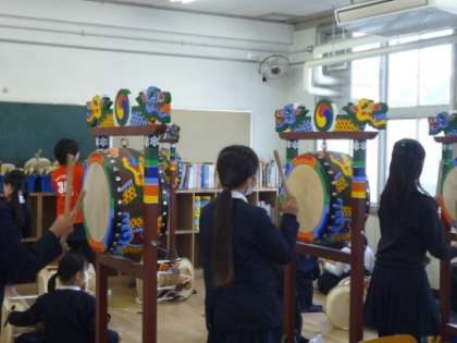 低学年は文化祭に向けてタルチュム(お面の踊り)の練習をしました。高学年は文化祭に向けてパートごとに楽器の練習をしました。4年生はプック。5年生はシャンゴ。6年生は両面太鼓。最後に合わせて合奏をしました。