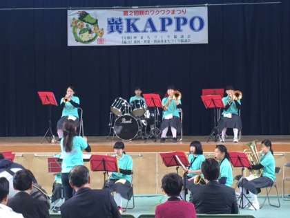 巽まちづくり協議会主催「巽KAPPO」の様子です。オープニングセレモニーで行われた巽中学校ブラスバンド部の演奏や、ミニ地下鉄、キックターゲットなど楽しい催しでいっぱいです。