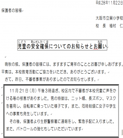 H28年11月22日(火) 児童の安全確保についてのお知らせとお願い