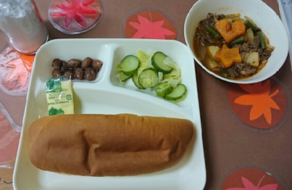 今日のパンはコッペパンでマーガリンがつきました。洋風煮にはハートと星のラッキーにんじんがはいっていました。