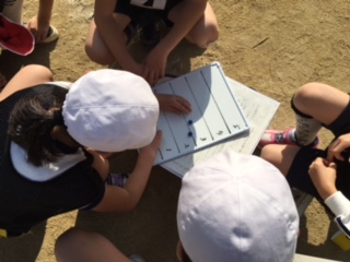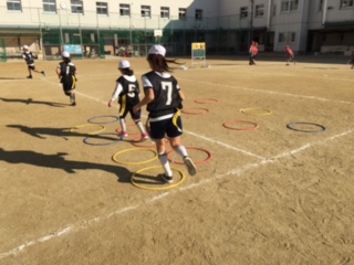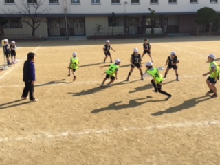 フラッグフットボールの学習です。「めあてを確認→チームで練習→ゲーム→作戦のねり直し→ゲーム→ふりかえり」といった流れで学習を進めていきます。仲間と協力し、主体的に学習する子どもたちの姿が見られました。