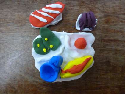 自分の作りたい食べもののイメージがすでにできていましたので、子どもたちは迷うことなくどんどん造っていきます。ただし、今日の粘土には色が付いていますので、形だけではなく、色の組み合わせも考えなくてはなりません。また、この粘土は色をかけ合せて、色を変えることもできます。