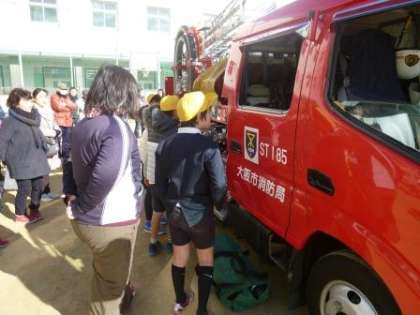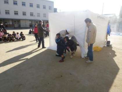 1・4年生は運動場で『暗室・煙体験』『消防車両・備蓄用品見学』の体験をしました。